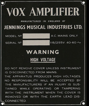 Model/Serial Plates for JMI Vox Amplifiers