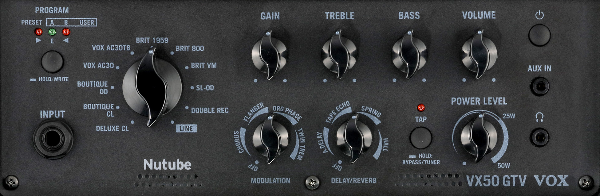 The preamp of the Vox VX50 VTX utilized a Korg Nutube 6P1. Korg Nutube technology uses a flouresecent display such as those included in modern keyboards to act as a vacuum tube. This provides the rich overtones of a traditional vacuum tube without the need for periodic replacement. The turquoise glow emanating from the Nutube 6P1 can be seen through a series of small holes located on the control panel.